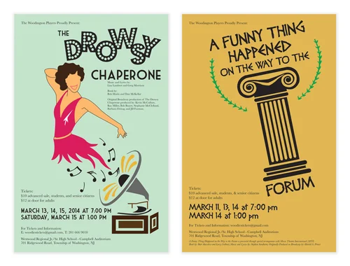 Fall Play and Spring Musical promotional collateral created for the Woodington Players, the theatre ensemble at Westwood Regional Jr./Sr. High School
